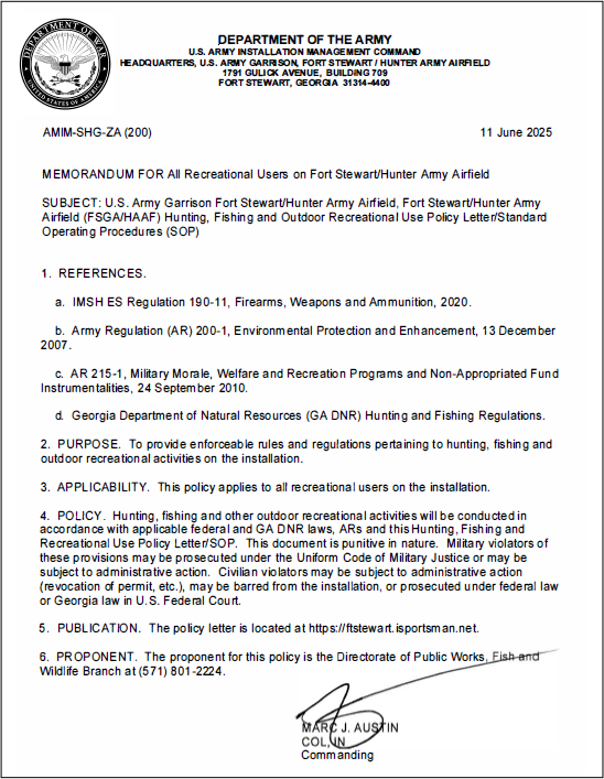 Ft Stewart-Hunter Army Airfield Hunting, Fishing & Outdoor Recreation SOP/Policy Letter